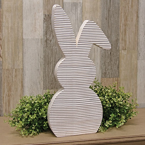 The distressed white bunny sitter is a perfect addition to your Easter decorating. It showcases a corrugated wooden silhouette with one floppy ear. 18"h x 8"w x 1.5"d.
