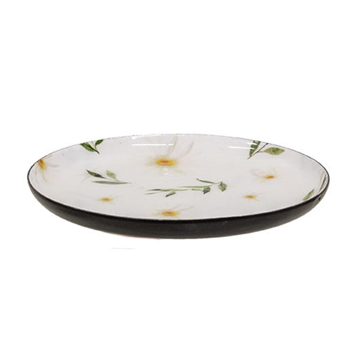 These decorative floral plates are a pretty way to display candles, trinkets, and more. They feature a delicate pattern of white daisy blossoms and leafy green branches on a smooth white finish, framed by a black painted rim. The plates are sold as a set of 2 sizes. The larger plate measures 6.25” in diameter, and the smaller plate measures 4” in diameter. Each plate is .5” high.